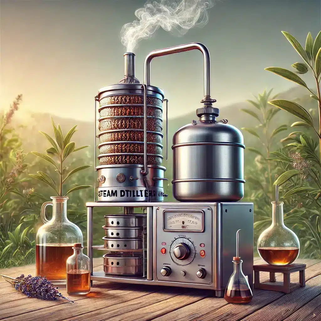 - É o método mais utilizado para a extração de óleos essenciais. Nessa técnica, vapor d’água é passado através da planta, e os compostos voláteis são levados com o vapor. O vapor é então resfriado, separando-se o óleo da água. Este processo é amplamente utilizado para óleos essenciais extraídos de flores, folhas e raízes, cascas, resinas, como o de eucalipto radiata, manjericão, manjerona, vetiver, patchouli, anis estrelado, breu, mirra, olíbano.